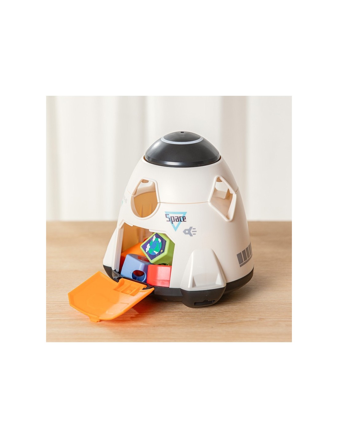 O nava spatiala frumoasa in care copiii pot alege caramizile si pot construi o varietate de forme si activitati diferite care le ajuta sa-si dezvolte imaginatia! Î nsirati formele puteti insira blocurile geometrice de-a lungul gaurilor unul cate unul, astfel incat copilul sa invete sa sorteze formele, sa recunoasca culorile si sa dezvolte coordonarea mana-ochi. Sortare forme invata grafica matematica cu jocul de potrivire a formelor. Apasati partea superioara a navei spatiale si capacul superior se va roti astfel incat gaurile din cabina sa isi schimbe forma. Asezati blocurile potrivite in gaurile cabinei pentru a invata recunoasterea formei.
