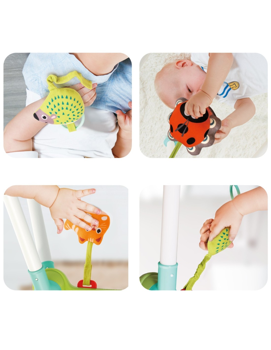 Este fabricat din material ABS si plastic durabil si de inalta calitate. Este complet sigur pentru copii. Aceasta jucarie este pentru intarirea muschilor bebelusilor si este o jucarie pentru baieti si fete.Are o baza asemanatoare cu baza unui leagan.Pliabil pentru transport usor.Poate fi folosit in 3 pozitii culcat pe spate, asezat si culcat pe burta. Prezinta 3 jucarii de plus un arici, o buburuza, o pisica.