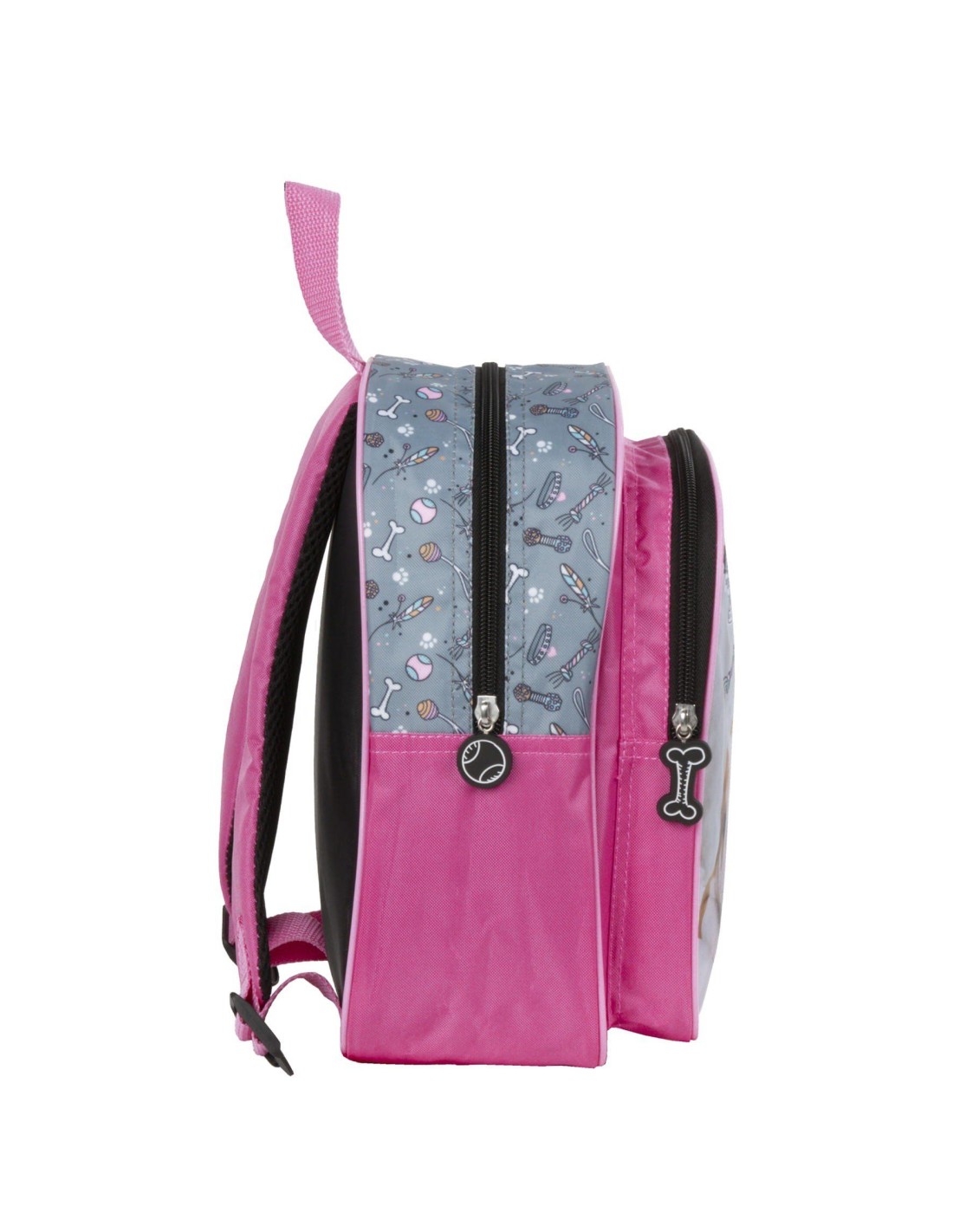 Acest rucsac este imprimitat predominant culoarea roz, avand anumite elemente gri si 2 catelusi super draguti, facandu-l cadoul ideal pentru fetite scolare si prescolare de diverse varste. Deasemeanea, este echipat cu doua compartimente cu fermoar si 2 buzunare laterale cu elastice pentru apa si diverse obiecte.