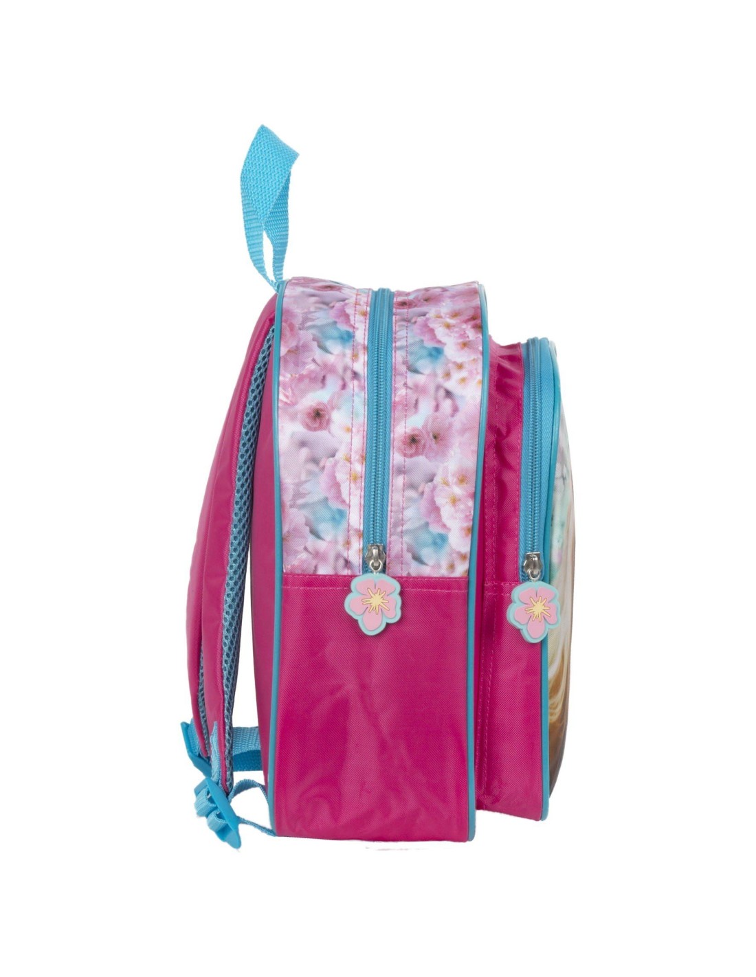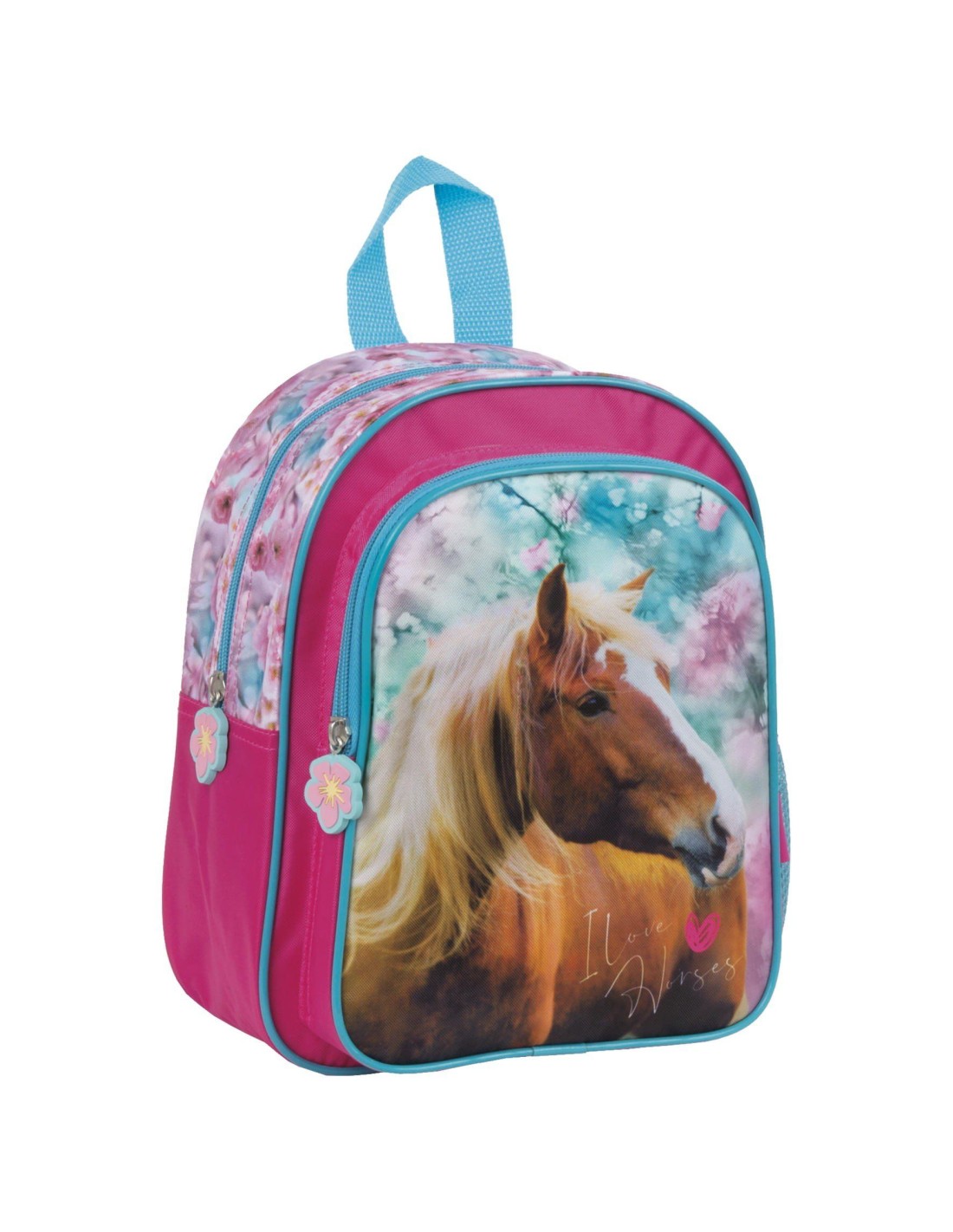 Acest rucsac este imprimitat predominant culoarea roz, avand anumite elemente albastre si un cal super dragut, facandu-l cadoul ideal pentru fetite scolare si prescolare de diverse varste. Deasemeanea, este echipat cu doua compartimente cu fermoar si 2 buzunare laterale cu elastice pentru apa si diverse obiecte.