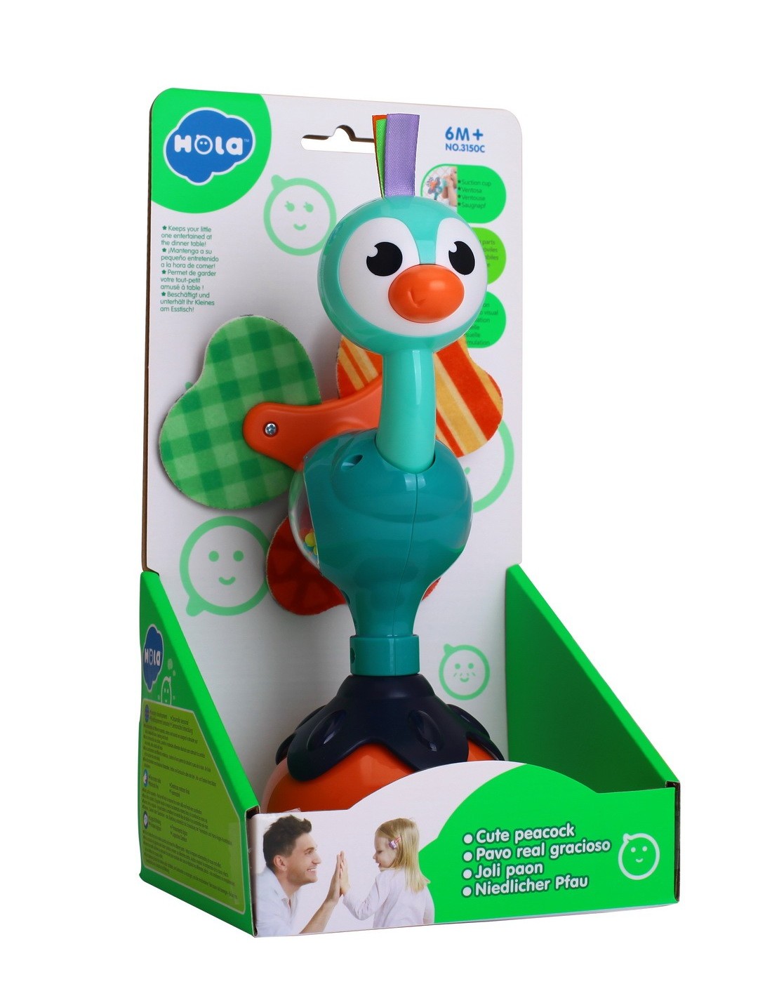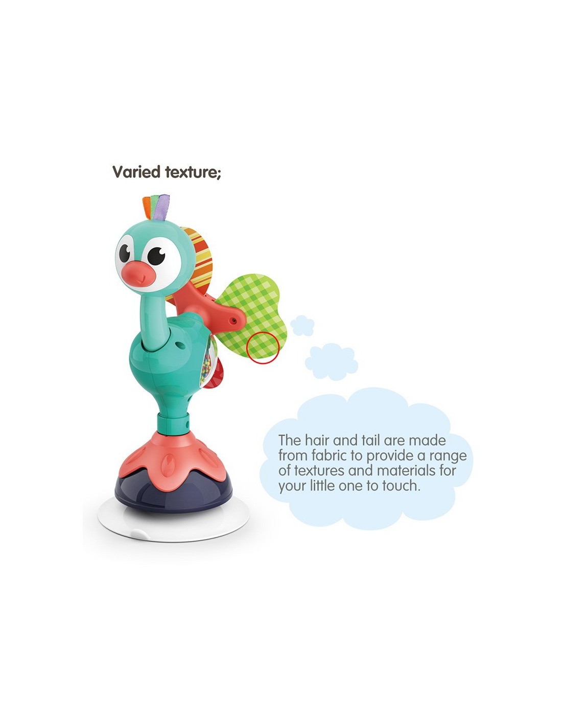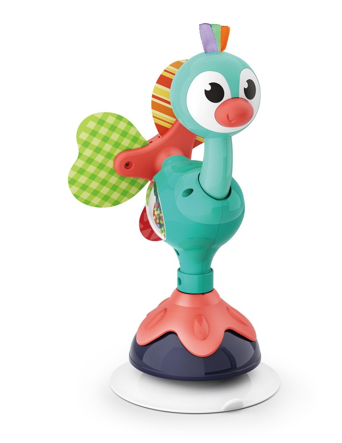 Jucaria Bebe Paun cu ventuza are parti mobile, texturi variante, culori diferite pentru stimulare vizuala si un design versatil si atragator. Jucaria se poate monta masa copilului, pe scaunul lui de masa, pe parchet sau alte suprafete plane. Jucaria are 5 locuri, in care copilul poate efectua diferite activitatii precum rotirea, tragerea, apasarea, etc.