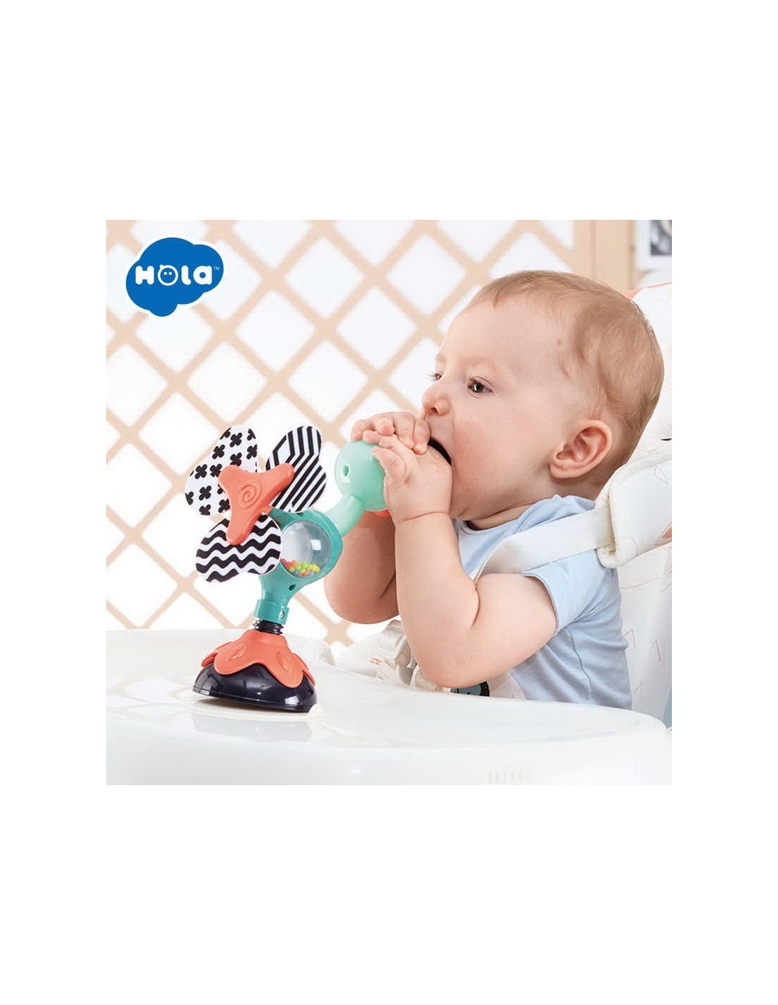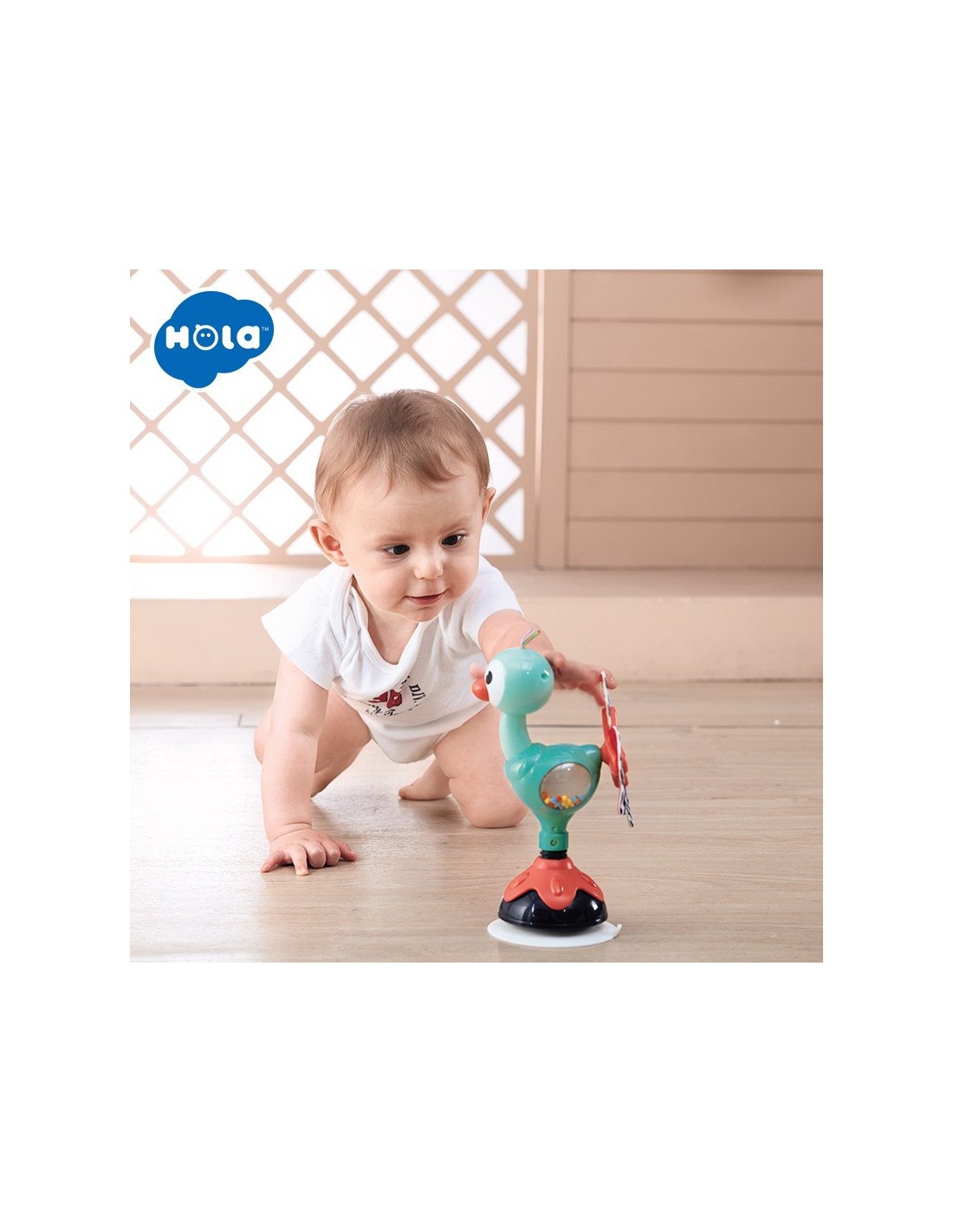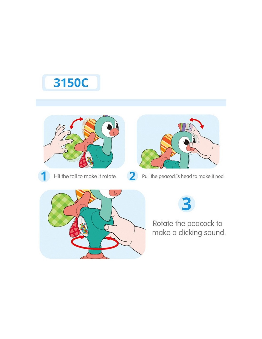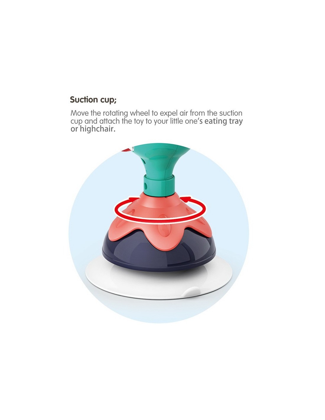 Jucaria Bebe Paun cu ventuza are parti mobile, texturi variante, culori diferite pentru stimulare vizuala si un design versatil si atragator. Jucaria se poate monta masa copilului, pe scaunul lui de masa, pe parchet sau alte suprafete plane. Jucaria are 5 locuri, in care copilul poate efectua diferite activitatii precum rotirea, tragerea, apasarea, etc.