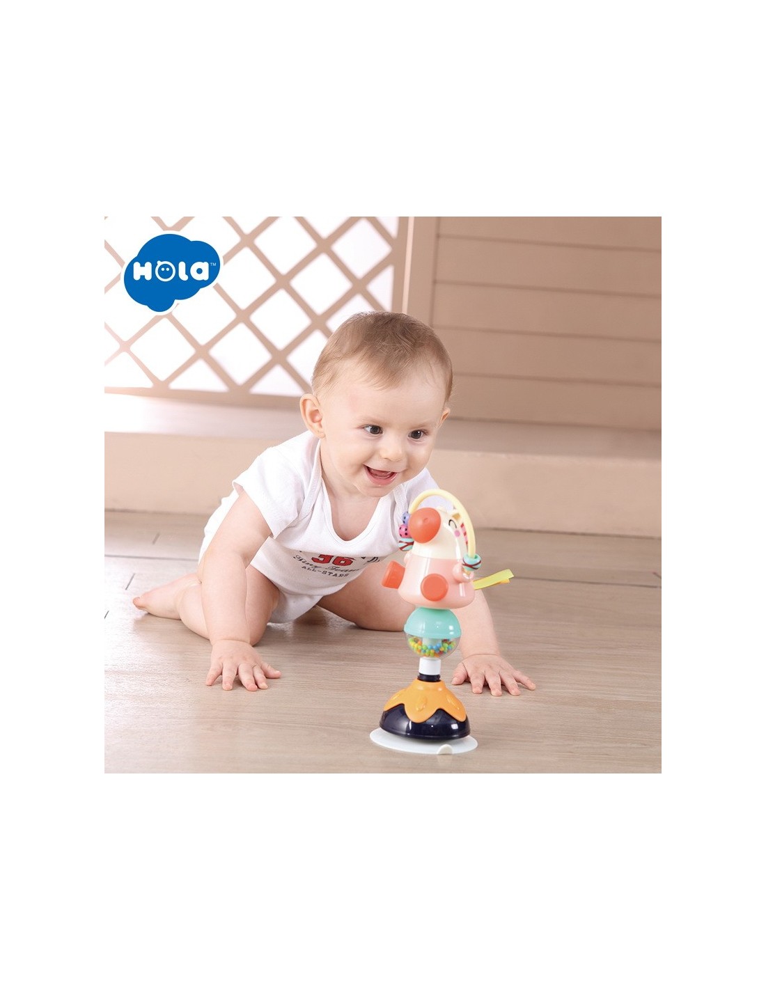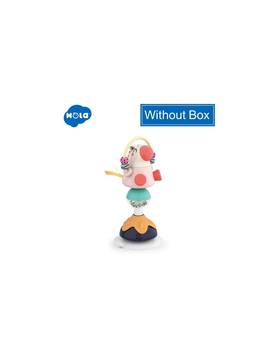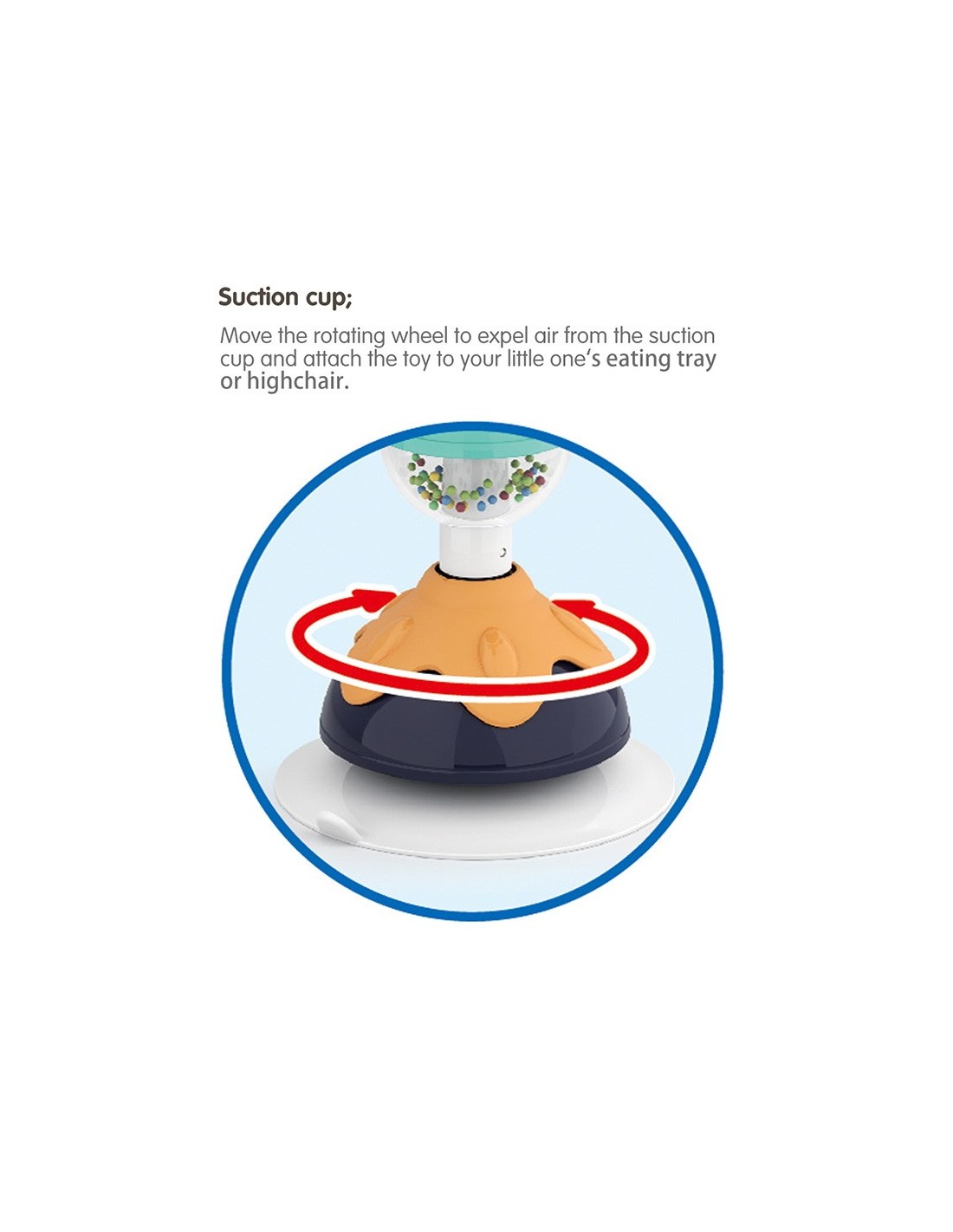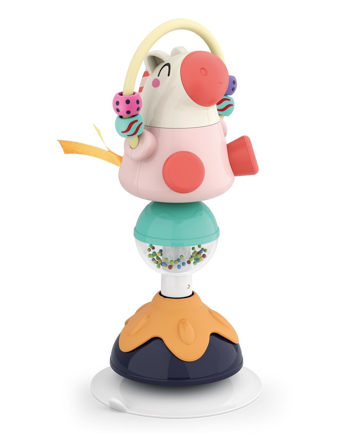 Jucaria Bebe Animalut cu ventuza are parti mobile, texturi variante, culori diferite pentru stimulare vizuala si un design versatil si atragator. Jucaria se poate monta masa copilului, pe scaunul lui de masa, pe parchet sau alte suprafete plane. Jucaria are 5 locuri, in care copilul poate efectua diferite activitatii precum rotirea, tragerea, apasarea, etc.