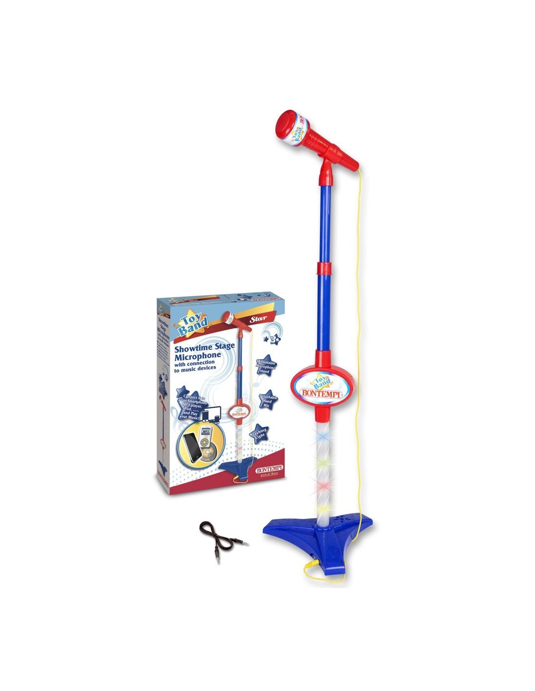 Microfon de scena.Suport pentru microfon reglabil.12 Demopsy.5 efecte sonore.5 ritmuri de tobe.Efecte luminoase.Conectarea la un player MP3 (Smartphone, iPod, CD player ) - Cablu incorporat.Alimentare 3 baterii R6 / AA 1.5V (nu sunt incluse).Dimensiune 195x225x1030 mm.Beneficii familiarizarea cu muzica si ritmul, dezvoltarea abilitatilor sociale si cognitive, coordonarea miscarilor, atentia distributiva.