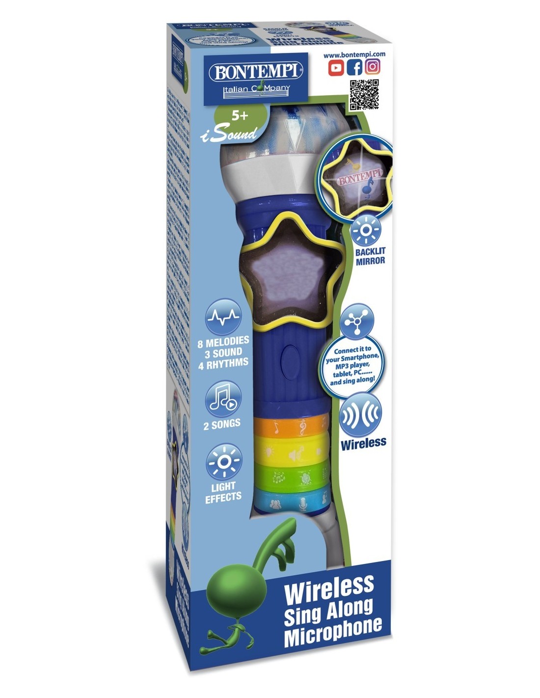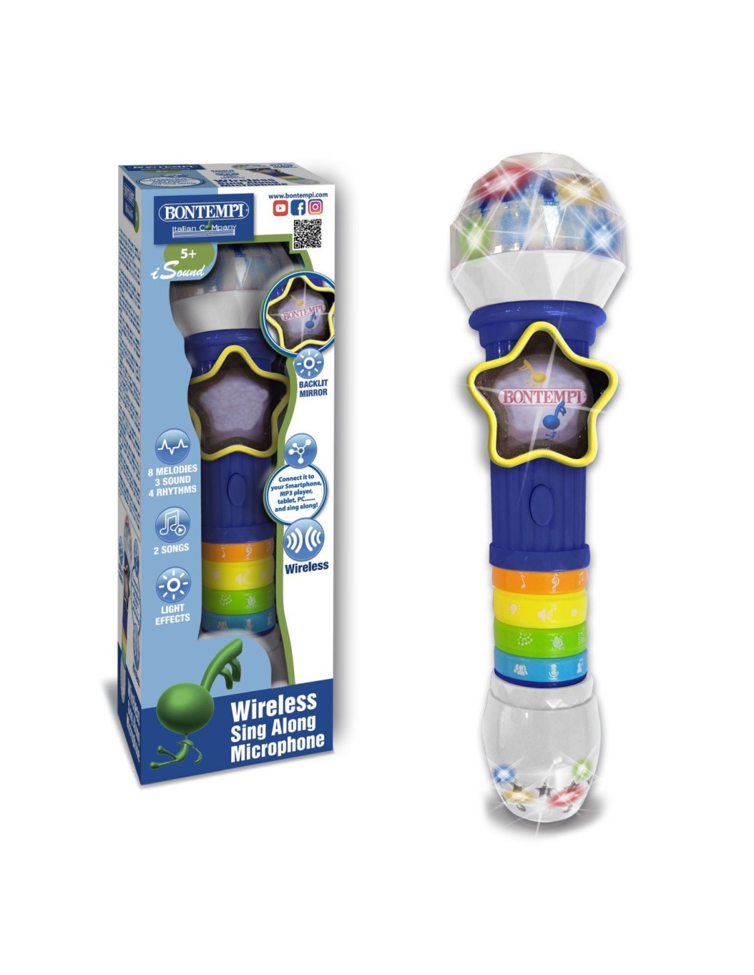 Microfonul wireless Bontempi ofera o experienta muzicala fara fir pentru cantaretii tineri.Microfonul foloseste o conexiune wireless pentru a se conecta la difuzor, permitand copiilor sa se miste liber in timpul spectacolelor, fara a fi limitati de cabluri.Microfonul are 2 melodii pre-inregistrate, 4 ritmuri diferite si 8 melodii pentru a insoti interpretarile vocale ale copiilor. Aceste optiuni ofera o varietate de stiluri muzicale de explorat si le permit copiilor sa creeze propriile versiuni ale cantecelor.Microfonul este echipat cu efecte de lumina care se aprind in timpul utilizarii. Aceste efecte de iluminare creeaza o atmosfera captivanta si captivanta in timpul spectacolelor pentru copii.Microfonul are o oglinda cu iluminare din spate care adauga un plus de stil si ofera un efect vizual interesant in timpul spectacolelor.