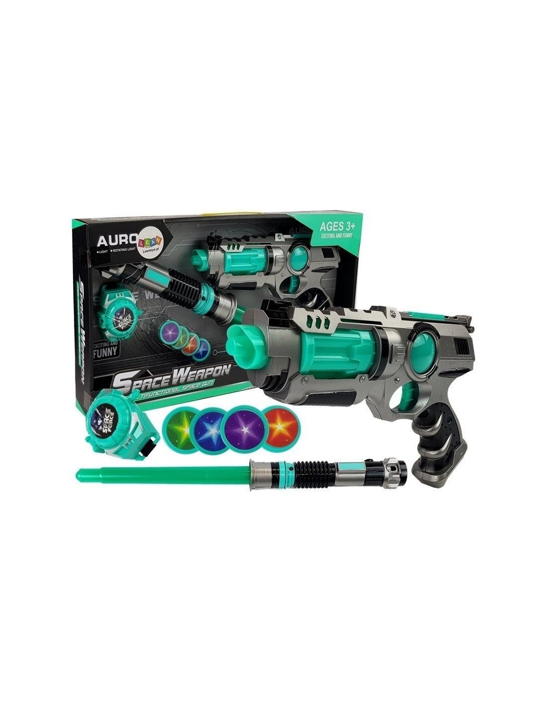 Set de joaca SF pentru copii, pistol laser, sabie laser si lansator de discuri, LeanToys, 7097