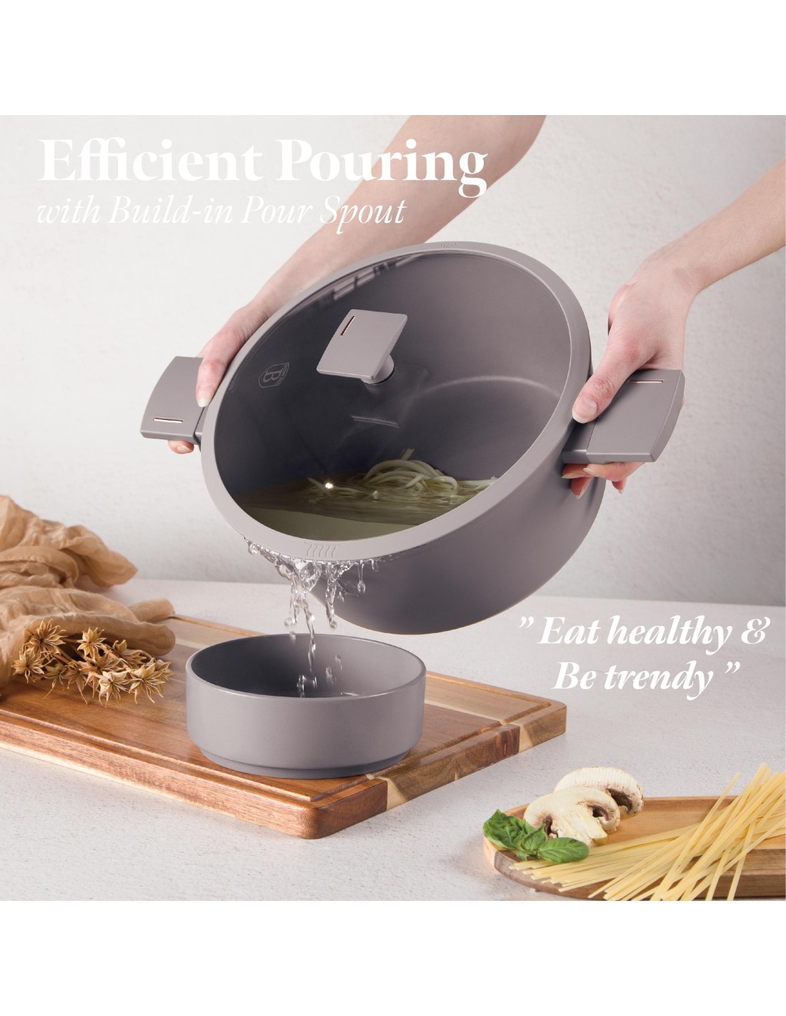 Cratita cu capac de 20 cm și capacitate de 2,5 litri din colecția Taupe, modelul Berlinger Haus BH/8100, este ideală pentru prepararea diverselor feluri de mâncare, combinând funcționalitatea cu un design elegant și minimalist.