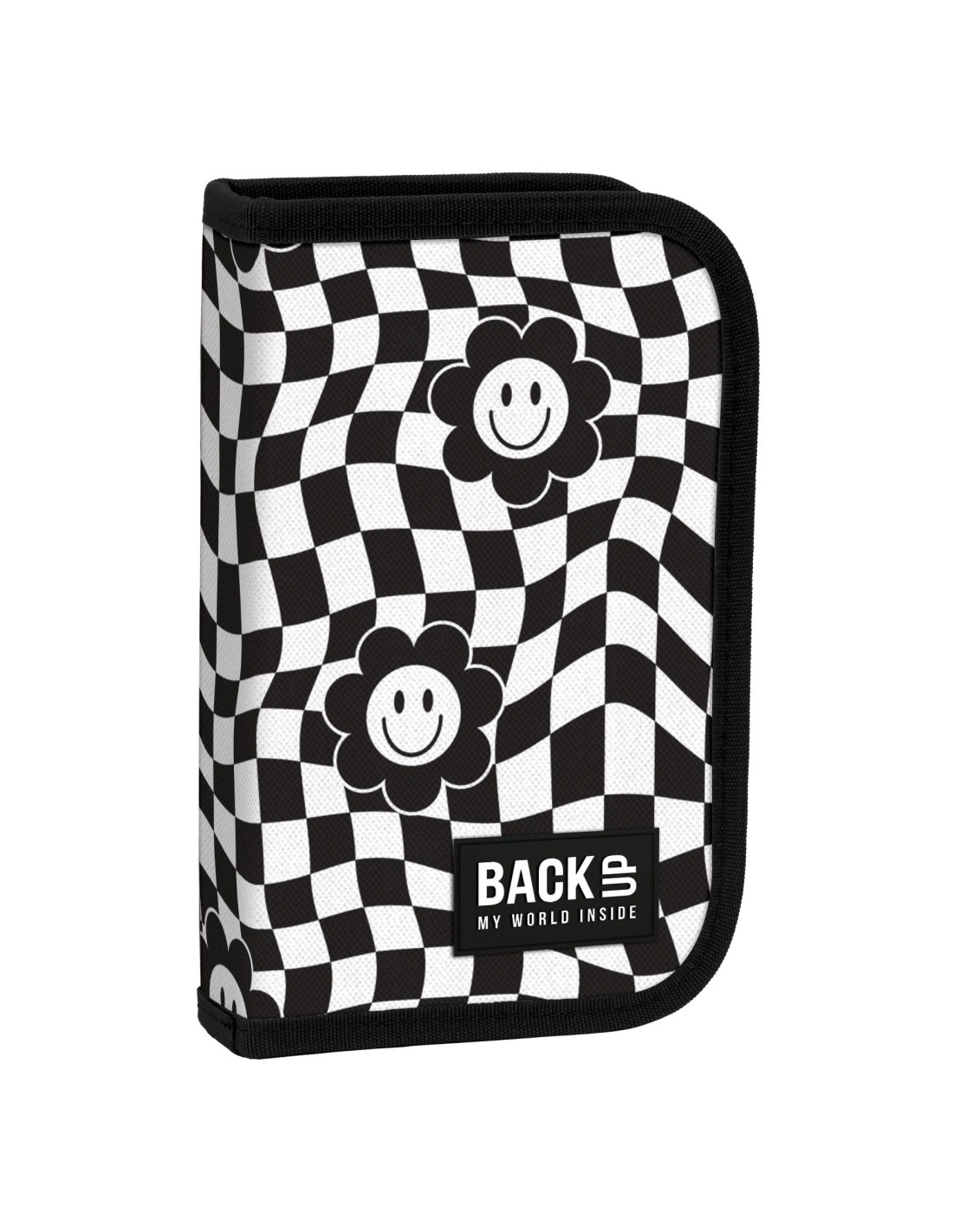 Un check atemporal într-o versiune nouă, asimetrică, combinată cu modelul cel mai la modă din acest sezon al unui emoji cu flori zâmbitoare. Această cutie de creion este o versiune nouă a stilului Y2K. Alb-negru clasic combinat cu un model neobișnuit va atrage atenția.