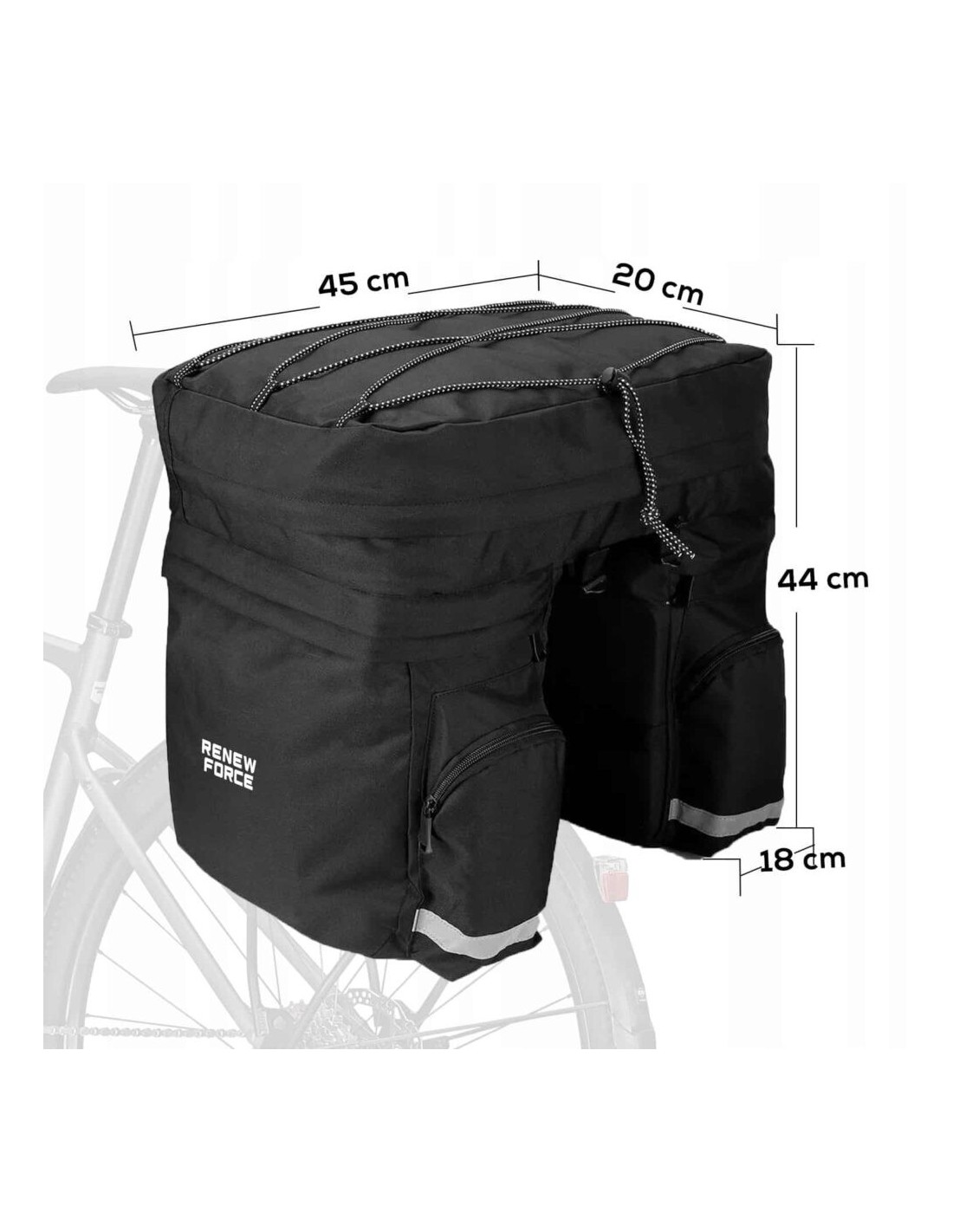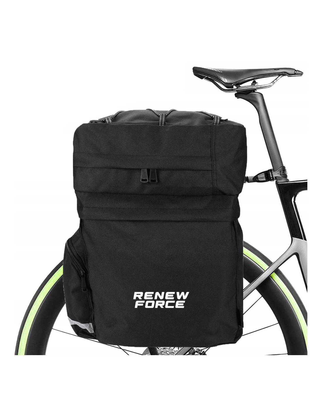 Geanta pentru biciclete Renew Force?a fost conceputa pentru a raspunde cerin?elor ciclist.?Pentru?a cre?te siguran?a conducerii?, ? special noaptea ?i ? condi?iile meteorologice dificile, geanta este echipata cu?elemente reflectorizante??i c?lige care permis instalarea reflectoarelor ?i luminilor.?Totul este?confectionat din material impermeabil?care va proteja elementele din interior in timpul ploii.?Accesul commod la compartiment ?i buzunare este asigurat de?fermoare?, iar plasa de cauciuc reglabila de pe clapa gen?ii ofera?spa?iu suplimentar?pentru ata?area unei sticle de apa, jachete ?i multe alte lucruri.
